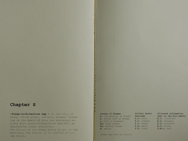 En la ciudad de S.H.E.E.P.S. el comportamiento real de los seres humanos se ha invertido. Soñar es la base de esta nueva sociedad, una sociedad más creativa y saludable. Todo el mundo trabaja mientras sueñan, trabajos creativos ejecutados por maquinas. El ser humano duerme ahora 18 horas al día y se mantiene despierto las 6 horas restantes. Estar despierto es un simple estado consciente de recarga espiritual y energética del cuerpo para seguir soñando. La ciudad se deja llevar por la gravedad, la naturaleza y la topografía. Dialoga con los Alpes, mirando a los Alpes, una ciudad donde soñar en granjas verticales de soñadores.